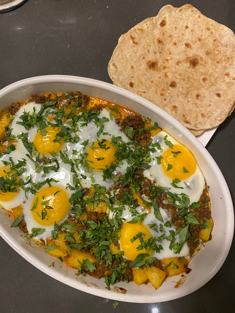 This casserole is as ubiquitous in Indian East African homes it gets. Although the dish didn’t make it in the final version of Accidentally Engaged, I imagine this is something that both Reena and Nadim would have grown up eating. A dry curry of ground beef and potatoes is topped with eggs, then baked in the oven until the eggs are set. Served with fresh maani or rotli (chapatti), the finished dish is a bit like huevos rancheros with an Indian twist. It’s a family favorite around here.